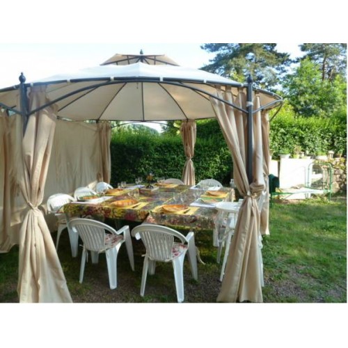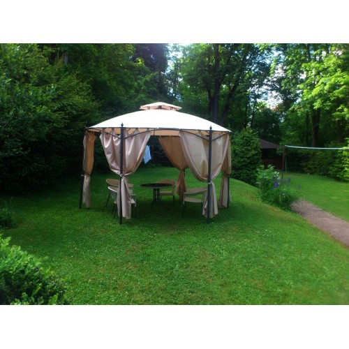 Плотные шторы для шестиугольной беседки представлены в бежевом цвете, который хорошо отражает солнечные лучи. Благодаря легкости ткани даже при закрытых полотнах внутри конструкции поддерживается оптимальная циркуляция воздуха.